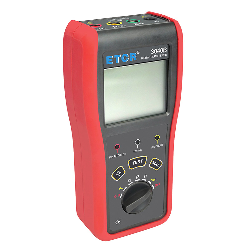 ETCR3040B接地电阻/土壤电阻率测试仪由主机、测试线等组成。具有自动关机功能、仪表全量程自动换挡、抗干扰能力强、操作更简易。其广泛应用于电力、电信、气象、油田、建筑、防雷及工业电气设备等的接地电阻测量、土壤电阻率、接地电压测量。