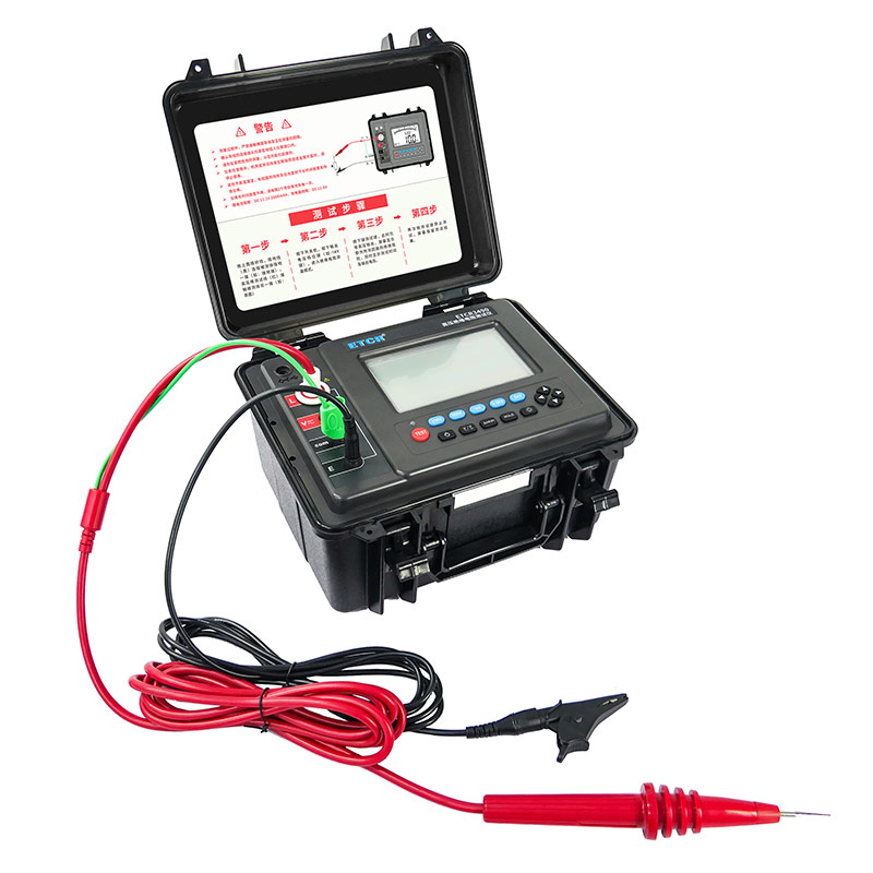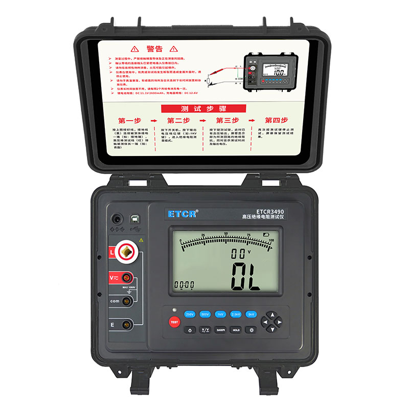 ETCR3490系列高压绝缘电阻测试仪又名兆欧表、绝缘电阻测试仪等,用于绝缘电阻的测试。本仪表是一款高性能数字式仪表,具有LCD大屏幕带背光显示、数据保持、自动放电、自动关机等功能。仪表具有测试计时,电压监测功能,回路电压大于36V时,仪表将禁止测试以保护被测物及人员安全。仪表功能操作简易,绝缘电阻值,测试时间,输出电压同屏显示,同时还具备吸收比、极化指数测试、交流电压、直流电压测试功能。